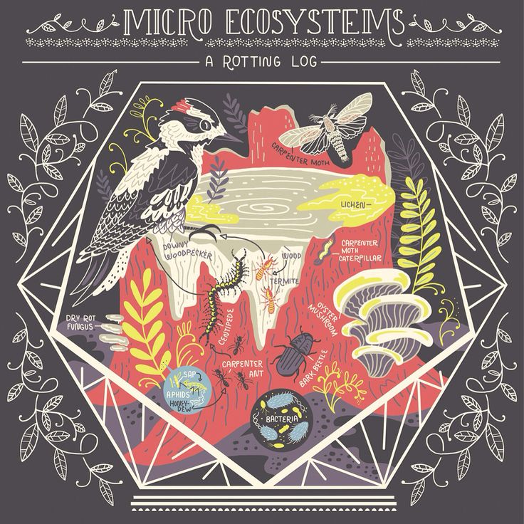 Featured image: A rotting log supports an entire ecosystem, from base recyclers to apex predators. (Courtesy Rachel Ignotofsky)